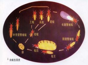 1. 散白蟻屬:包括黃胸散白蟻和黑胸散白蟻。因群體小而分散,故稱為散白蟻。他們對建筑物破壞性較大,主要危害地擱柵、梁、木柱子、門框、地板等。一般在每年3—5月上旬中午前后,長翅繁殖蟻開始分飛,建立新家庭。