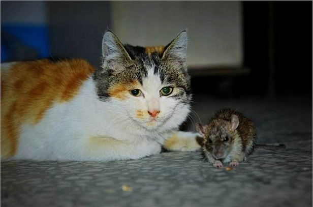 結(jié)果在79天的觀察過程中,每天在老鼠身邊發(fā)現(xiàn)多達(dá)三只活躍的野貓。而這段時(shí)間來,野貓只進(jìn)行了三次對(duì)老鼠的殺戮——僅僅看到兩只老鼠被抓。還有超過300次老鼠和貓的“擦肩而過”以及數(shù)不清地那個(gè)場(chǎng)景——貓遠(yuǎn)遠(yuǎn)望著老鼠,好像對(duì)老鼠失去了興趣。