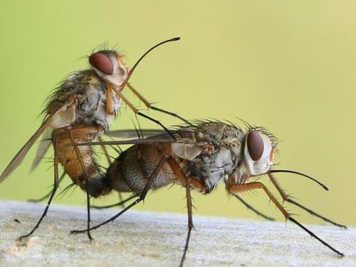 在適宜溫度下,雄性家蠅羽化后 18~24 小時、雌性家蠅羽化后 30 小時即可性成熟而交配。交配時間一般在清晨的 5:00~7:00。靈敏的嗅覺、性外激素和視覺,均是促進雌雄蠅交配的重要因素。一對正在交配的家蠅,可以久駐一處,一同爬行,雙飛翔,有效交配時間長達 1 小時。絕大多數(shù)家蠅終生只交配一次。雄蠅的精液可以長久貯存于雌蠅的受精囊中,刺激產(chǎn)卵,并持續(xù) 2~3 周使蠅卵不斷受精,而不必與另一只雄蠅交配。這在其他昆蟲中是罕見的。這正是蒼蠅繁殖力旺盛的重要原因。